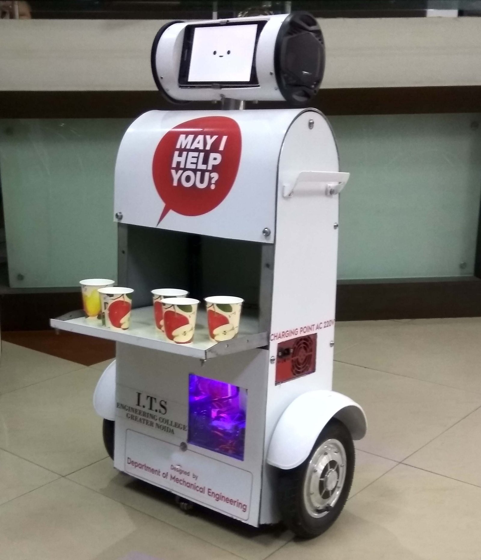 at offices, colleges, or malls. It can greet guests, provide